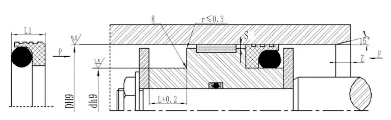 | Ardatzaren diametroaren barrutia Kalitate D f8 RC2061 | Ardatzaren diametroaren barrutia Mota astuna D f8 RC2061-Z | Groove diametroa D h9 | Groove zabalera Kerr+0.2 | Zigiluaren zabalera L1 | Txoko biribilak Rmaax | Radial Clearance Smax | Finfe Kirm | O-ring alanbre diametroa | ||